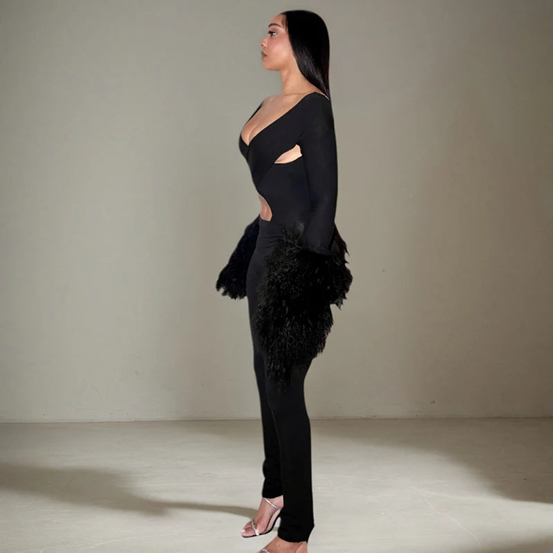 Dramatic, long-sleeve jumpsuit in sleek black.