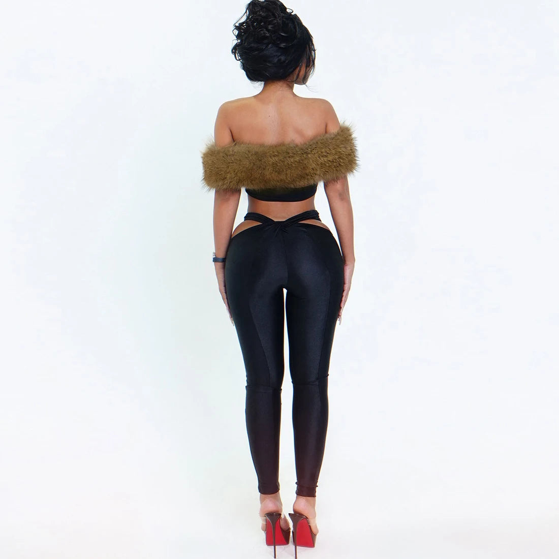 Off-the-shoulder crop top accented with plush faux fur trim.