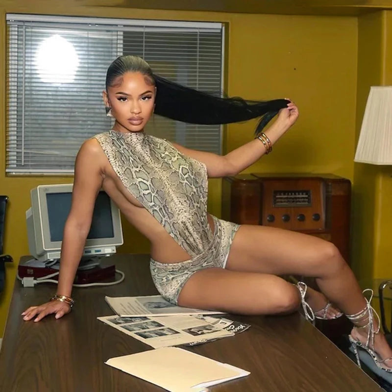 Includes a high-neck bodysuit with a sleek, sleeveless design.