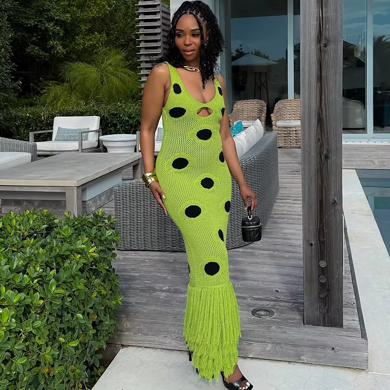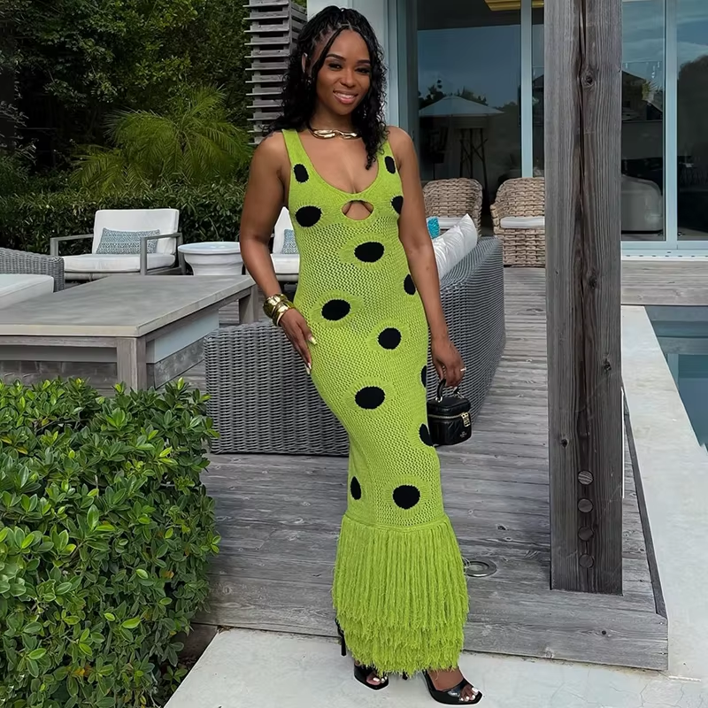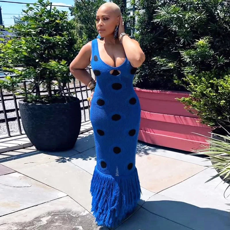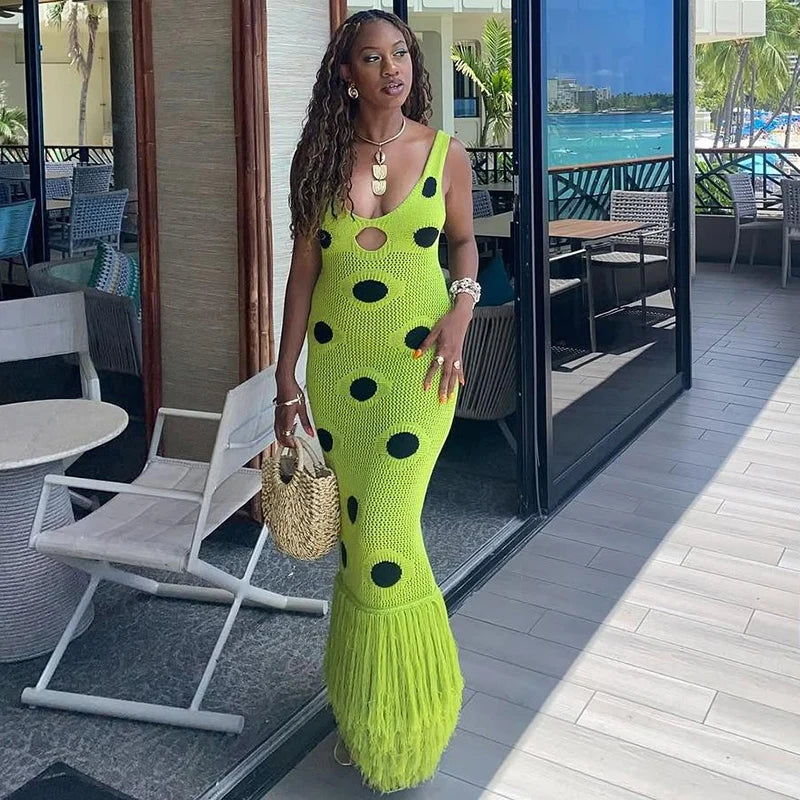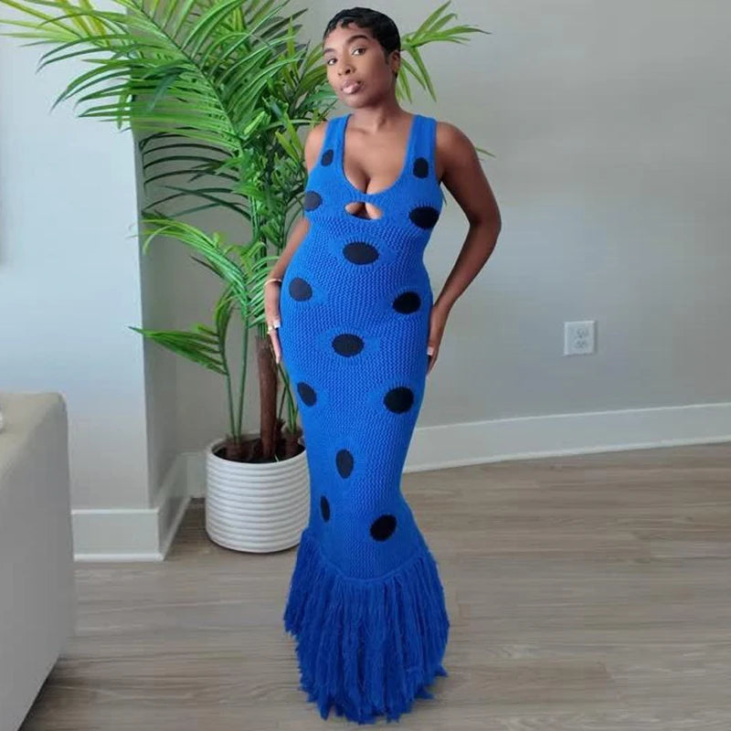 Statement knit maxi dress with playful large-dot pattern.