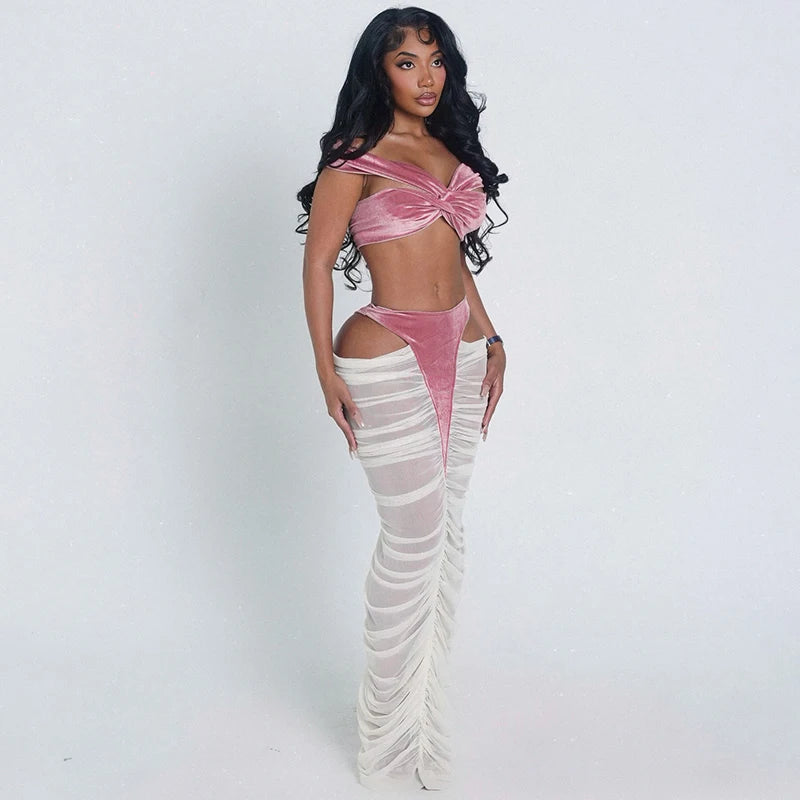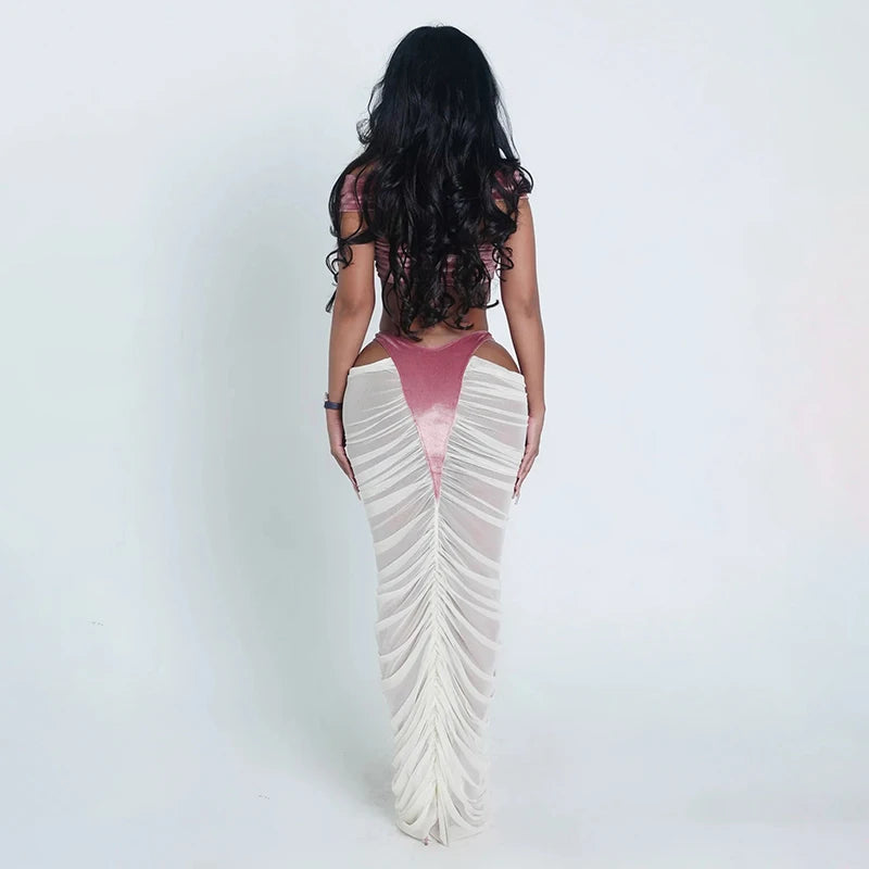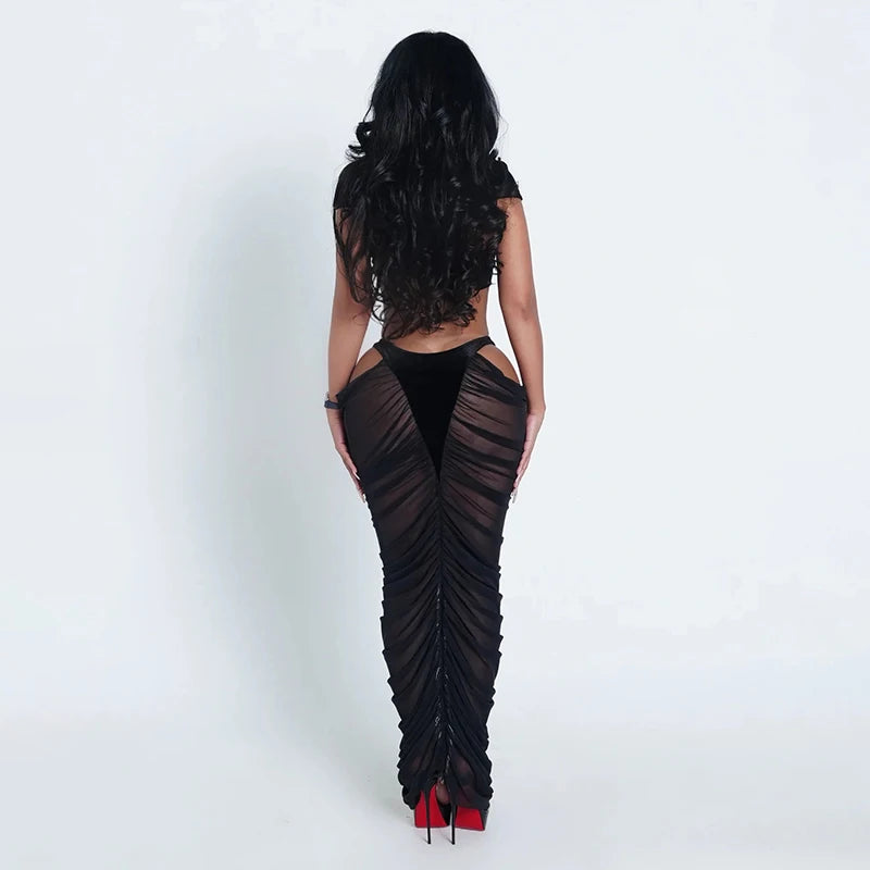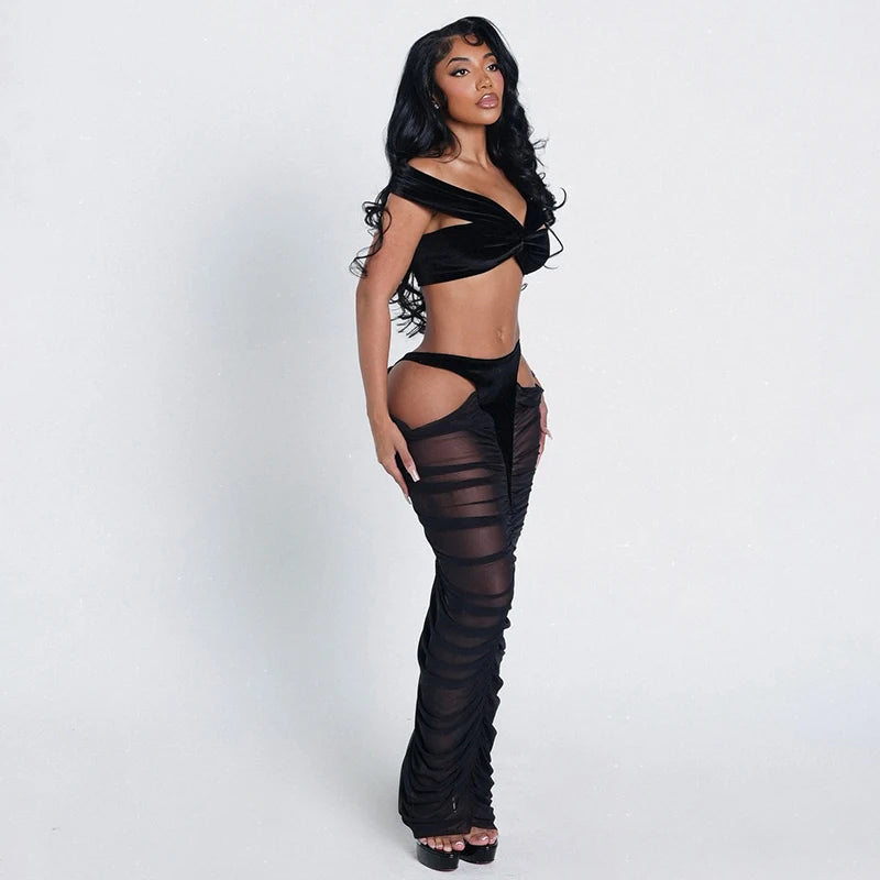 Matching sheer mesh pants with unique ruching and horizontal stripe detailing.